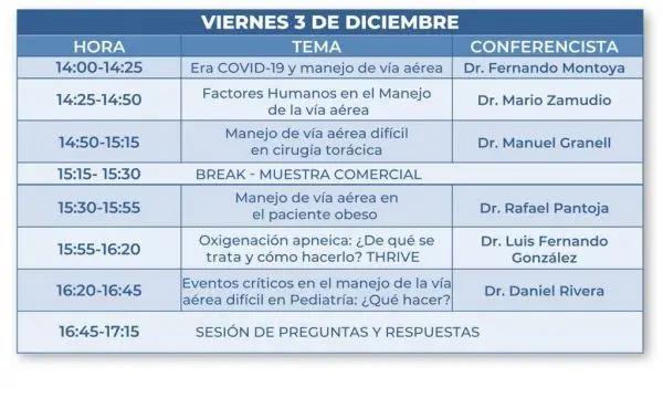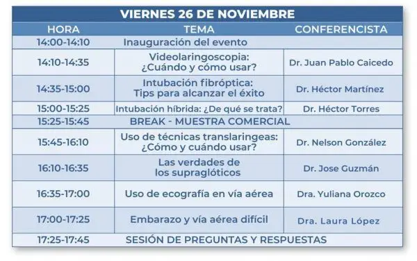 El evento se desarrollará los días 26 de noviembre y 03 de diciembre, en un horario de 2:00 p.m. a 5:45 p.m. y contará con 12 conferencistas nacionales e internacionales, entre ellos el Dr. José Guzmán, la Dra. Yuliana Orozco y el Dr. Rafael Pantoja, entre otros. Y se abordarán conferencias como: el uso de ecografía en vías aéreas y las verdades de los supraglóticos. A continuación, consulte el programa académico del evento: