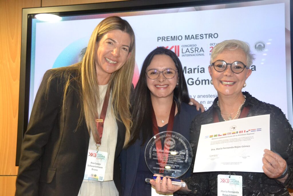 El Premio Maestro LASRA 2025 fue otorgado a la Dra. María Fernanda Rojas Gómez, médica anestesióloga con formación en anestesia regional guiada por ultrasonido en programas de CLASA, ASA, ASRA, Toronto Western Hospital y NYSORA, y fellow delprograma CLASA–WFSA–SBA en Fortaleza, Brasil. Su trayectoria académica y humana la consolida como una líder en la enseñanza y promoción de las buenas prácticas anestésicas en la región.