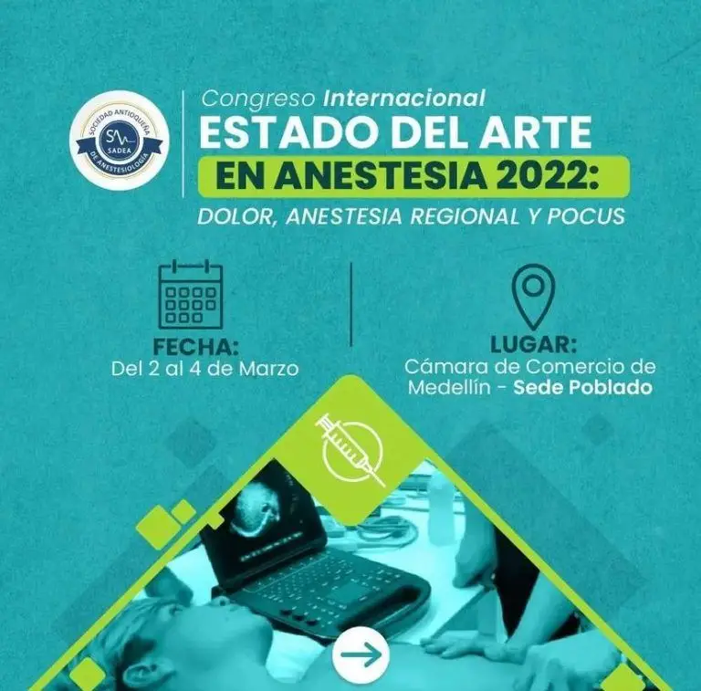 Con el fin de actualizar conocimientos en los tópicos más importantes de la anestesiología basados en evidencia científica y contribuir a la práctica anestésica con altos estándares de calidad, la Sociedad Antioqueña de Anestesiología, SADEA, invita a su congreso Estado del Arte en Anestesia 2022. Un evento académico dirigido a anestesiólogos, estudiantes del posgrado de anestesia y especialistas en dolor e intervencionismo analgésico, latinoamericanos pertenecientes a las sociedades adscritas a la Confederación Latinoamericana de Sociedades de Anestesiología – CLASA.